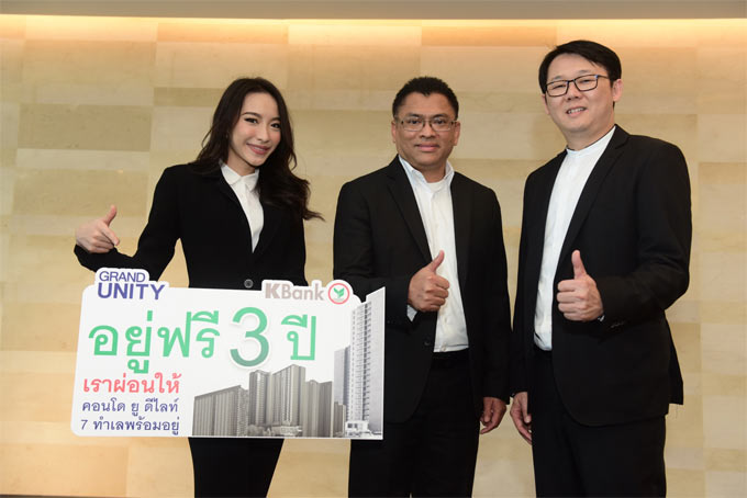 นายอลงกต บุญมาสุข (กลาง) ผู้อำนวยการฝ่ายอาวุโส ฝ่ายบริหารผลิตภัณฑ์สินเชื่อเพื่อที่อยู่อาศัยและสินเชื่อธุรกิจขนาดย่อม ธนาคารกสิกรไทย และนายสิริพงศ์ ศรีสว่างวงศ์ (ขวา) กรรมการผู้จัดการ บริษัท แกรนด์ ยูนิตี้ ดิเวลล็อปเมนท์ จำกัด ร่วมเปิดตัวแคมเปญ "แช่แข็งเงินผ่อน" มอบสิทธิพิเศษสำหรับลูกค้าสินเชื่อบ้านกสิกรไทยที่ซื้อคอนโดมิเนียม ยู ดีไลท์ ของแกรนด์  ยูนิตี้ 7 โครงการสามารถเข้าอยู่โดยไม่ต้องผ่อนชำระสินเชื่อบ้านนาน 3 ปี สำหรับลูกค้าที่สมัครและทำสัญญาจดจำนอง ตั้งแต่วันนี้ - 31 กรกฎาคม 2560