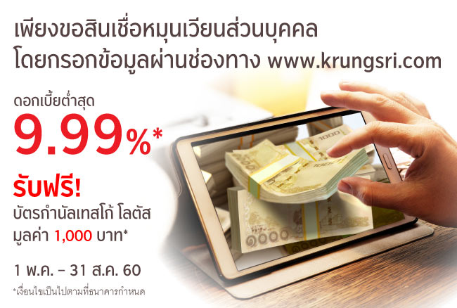 รับฟรี! บัตรกำนัลเทสโก้ โลตัส มูลค่า 1,000 บาท เมื่อสมัครสินเชื่อกรุงศรีผ่านออนไลน์ วันนี้ - 31 ส.ค. 60
