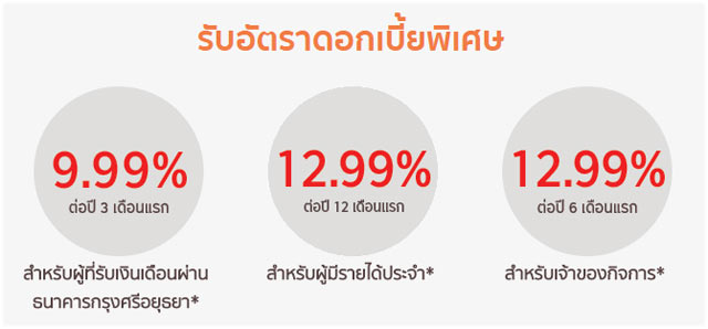 เงื่อนไขการรับอัตราดอกเบี้ยพิเศษ - อัตราดอกเบี้ย 9.99% ต่อปี 3 เดือนแรก สำหรับพนักงานประจำที่รับเงินเดือนผ่านธนาคารกรุงศรีอยุธยา อายุงานตั้งแต่ 1 ปีขึ้นไป รายได้เป็นไปตามหลักเกณฑ์ของธนาคารกรุงศรีอยุธยา และรับเงินกู้โดยวิธีโอนเงินเข้าบัญชีเงินฝากธนาคารเท่านั้น