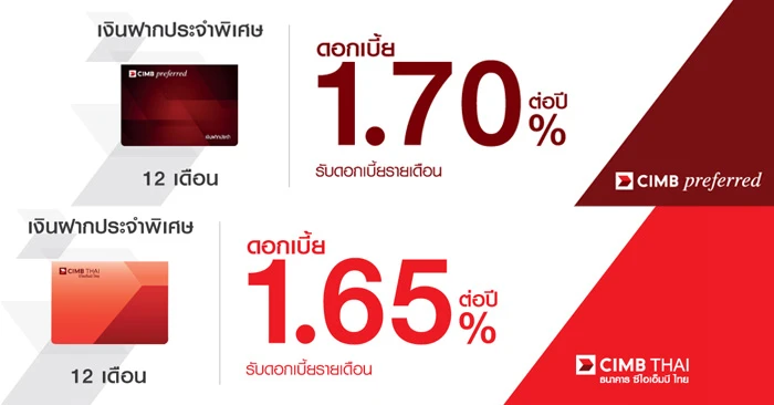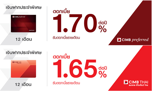บัญชีเงินฝากประจำพิเศษ 12 เดือน อัตราดอกเบี้ย 1.70% ต่อปี สำหรับลูกค้า CIMB Preferred