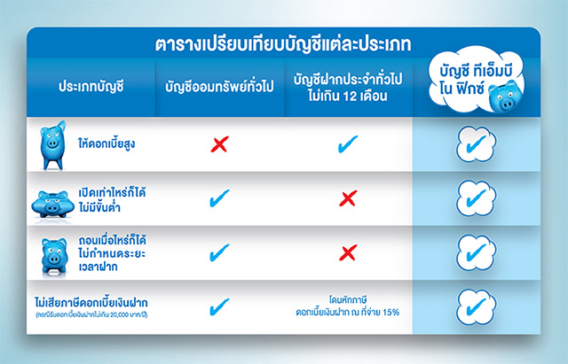 - ถอนหรือโอนเงินที่สาขา TMB ได้ 2 ครั้งต่อเดือน ครั้งถัดไปเสียค่าธรรมเนียมครั้งละ 50 บาท ค่าธรรมเนียมอื่นๆ เป็นไปตามประกาศธนาคาร