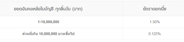 อัตราดอกเบี้ย ณ วันที่ 1 เมษายน 2560 สิทธิประโยชน์สำหรับลูกค้าทีเอ็มบี : สามารถรับดอกเบี้ยเพิ่ม 0.3% เป็นสูงสุด 1.6% ได้ในเดือนถัดไป หากปัจจุบันมียอดเงินฝากคงเหลือในบัญชีเฉลี่ยตั้งแต่ 2 ล้านบาทขึ้นไป