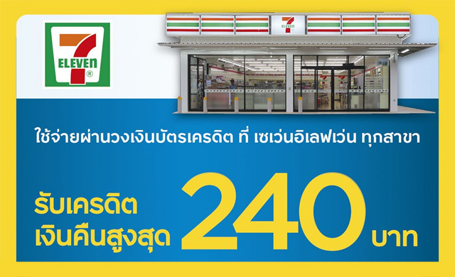 รับเครดิตเงินคืนสูงสุด 240 บาท เมื่อใช้จ่ายที่ เซเว่นอิเลฟเว่น ทุกสาขา ผ่าน