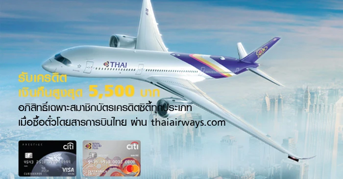 รับเครดิตเงินคืนสูงสุด 5,500 บาท เมื่อซื้อบัตรโดยสารการบินไทย ผ่าน thaiairways.com ด้วยบัตรเครดิตซิตี้