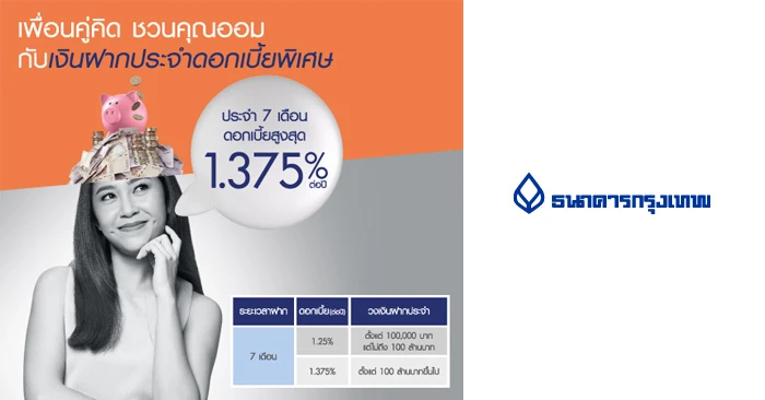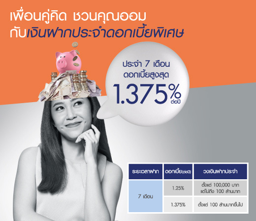 | 7 เดือน | 1.375% ต่อปี | ตั้งแต่ 100 ล้านบาทขึ้นไป |