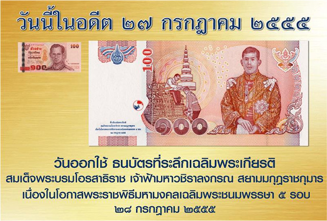 วันนี้ในอดีต 27 กรกฎาคม 2555 วันออกใช้ธนบัตรที่ระลึกเฉลิมพระเกียรติ สมเด็จพระบรมโอรสาธิราช เจ้าฟ้ามหาวชิราลงกรณ สยามมกุฎราชกุมาร เนื่องในโอกาสพระราชพิธีมหามงคลเฉลิมพระชนมพรรษา 5 รอบ 28 กรกฎาคม 2555