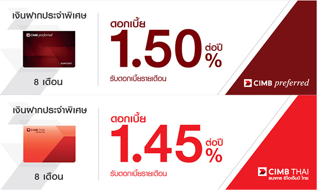 บัญชีเงินฝากประจำพิเศษ 8 เดือน อัตราดอกเบี้ย 1.50% ต่อปี สำหรับลูกค้า CIMB Preferred