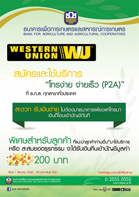 Western Union BAAC ใช้ดีบอกต่อ สมัครและใช้บริการ "โทรง่าย จ่ายเร็ว (P2A)" กับ ธ.ก.ส. วันนี้ พร้อมรับโปรโมชั่นเงินคืนเข้าบัญชีมูลค่า 200 บาท เมื่อแนะนำลูกค้าท่านอื่น*มาใช้บริการ หรือสะสมยอดธุรกรรมครบตามที่ธนาคารกำหนด