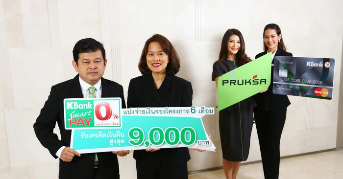 กสิกรไทย ร่วมกับ พฤกษา เรียลเอสเตท อัดแคมเปญผ่อน 0% นาน 6 เดือน พร้อมรับเครดิตเงินคืนสูงสุด 9,000 บาท เมื่อผ่อนชำระผ่านบัตรเครดิตกสิกรไทย... โดย นางสาวศุภนีวรรณ จูตระกูล ผู้ช่วยกรรมการผู้จัดการ ธนาคารกสิกรไทย และนายปิยะ ประยงค์ ประธานเจ้าหน้าที่บริหาร กลุ่มธุรกิจพฤกษา เรียลเอสเตท ร่วมเปิดแคมเปญ "LIVE FREE LIFE FLOW" มอบสิทธิพิเศษสำหรับลูกค้าที่ใช้บริการบัตรเครดิตกสิกรไทย เมื่อซื้อที่อยู่อาศัยโครงการของพฤกษา เรียลเอสเตท ที่ร่วมรายการ สามารถแบ่งจ่ายเงินจองหรือเงินทำสัญญาผ่านบริการ KBank Smart Pay 0% นาน 6 เดือน และได้รับเครดิตเงินคืนสูงสุด 9,000 บาท