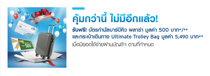 2) รับฟรี บัตรกำนัลบาร์บีคิว พลาซ่า มูลค่า 500 บาท และกระเป๋าเดินทาง Ultimate Trolley Bag มูลค่า 5,490 บาท เมื่อมียอดกดเงินสดรวมขั้นต่ำ 10,000 บาท และยอดแบ่งชำระรายเดือนโปรแกรม Citi PayLite รวมขั้นต่ำ 10,000 บาท และยอดโปรแกรมเงินสดโทรสั่งได้รวมขั้นต่ำ 10,000 บาท - ยอดใช้จ่ายรวมในแต่ละโปรแกรม (Citi PayLite, เงินสดโทรสั่งได้, กดเงินสด) หมายถึงยอดใช้จ่ายรวมของโปรแกรมนั้นๆ ภายในเวลาท ี่กำหนด เช่น ยอดรวมโปรแกรม Citi PayLite 10,000 บาท อาจจะเกิดจากการทำ Citi PayLite 2 รายการ ไม่จำเป็นจะต้องทำเพียงรายการเดียว เพื่อให้ได้ยอดขั้นต่ำ 10,000 บาท