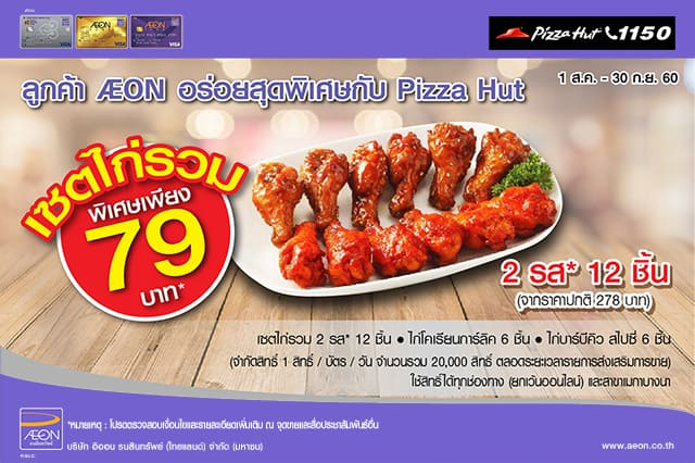 ลูกค้า AEON อร่อยสุดพิเศษกับ Pizza Hut.. รับสิทธิ์ซื้อเซตไก่รวม 2 รส ในราคา 79 บาท จากราคาปกติ 278 บาท ที่ร้าน Pizza Hut ทุกสาขาที่ร่วมรายการ และชำระผ่าน