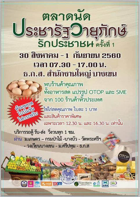 เพื่อช่วยเหลือและส่งเสริมให้ประชาชนผู้มีรายได้น้อย สร้างรายได้ ตามนโยบายกระทรวงการคลัง โดยมีสินค้ากว่า 100 บูธ พร้อมโปรโมชั่นพิเศษ ราคาถูกไข่ไก่ฟองละ 1 บาท ณ ธ.ก.ส.สำนักงานใหญ่ บางเขน 30 สิงหาคม 2560 ถึง 1 กันยายน 2560 นี้ ตั้งแต่เวลา 7.30-17.00 น.