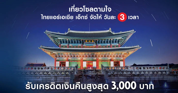 เที่ยวโซลตามใจ ไทยแอร์เอเชีย เอ็กซ์ จัดให้ วันละ 3 เวลา... รับเครดิตเงินคืนสูงสุด 3,000 บาท เมื่อซื้อตั๋วเครื่องบินผ่าน www.airasia.com ทุกๆ การใช้จ่าย 5,000 บาท/ เซลล์สลิป รับเครดิตเงินคืน 250 บาท (จำกัดเครดิตเงินคืนสูงสุด 1,000 บาท/ ลูกค้า/ เดือน)