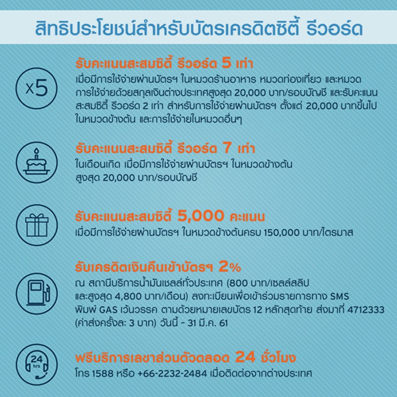 • รับคะแนนสะสมซิตี้ รีวอร์ด 7 เท่า เมื่อใช้จ่ายผ่านบัตรฯ ในเดือนเกิดในหมวดข้างต้น สูงสุด 20,000 บาท/ รอบบัญชี