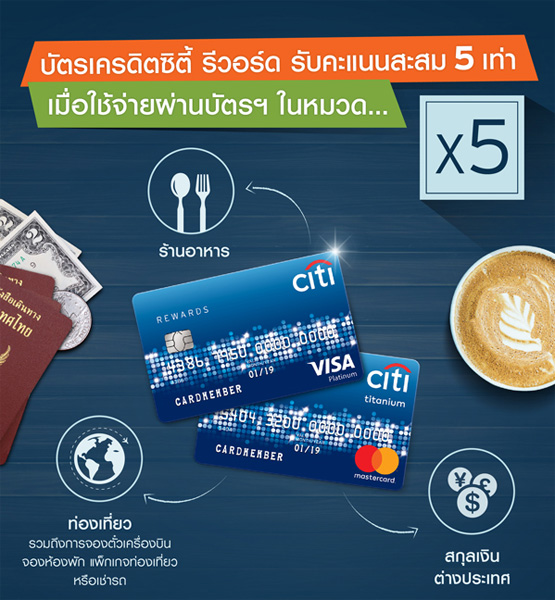 รับคะแนนสะสม 5 เท่า เมื่อใช้จ่ายผ่านบัตรเครดิตซิตี้ รีวอร์ด ในหมวดร้านอาหาร ท่องเที่ยว และสกุลเงินต่างประเทศ