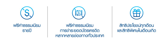 - ฟรีค่าธรรมเนียมรายปีตลอดชีพโดยไม่มีเงื่อนไข ไม่มีค่าธรรมเนียมการชำระบิลบัตรเครดิตล่าช้า และไม่มีค่าธรรมเนียมการออกบัตรฯ ใหม่