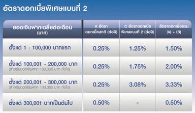 อัตราดอกเบี้ยพิเศษ แบบที่ 2 : - มียอดเงินฝากเฉลี่ยต่อเดือน ตามที่ธนาคารกำหนด และเป็นผู้ถือบัตรเดบิต หรือบัตรเครดิตที่เป็นบัตรหลัก และ