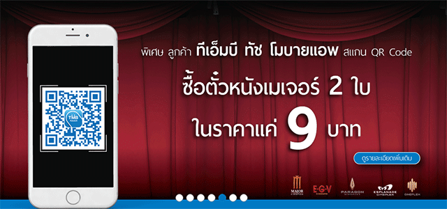 ลูกค้าทีเอ็มบี ทัช โมบายแอพ ซื้อตั๋วหนัง 2 ที่นั่ง ในราคาพิเศษ 9 บาท เมื่อชำระค่าตั๋วผ่านการสแกน QR Code ณ จุดจำหน่ายบัตรชมภาพยนตร์เมเจอร์ (Box Office) และสำหรับลูกค้าใหม่ที่เปิดบัญชี ทีเอ็มบี ออลล์ ฟรี พร้อมเปิดใช้งาน ทีเอ็มบี ทัช โมบายแอพ ภายในวันเดียวกัน รับฟรีตั๋วหนัง 1 ที่นั่ง สมัครเลยที่ TMB ทุกสาขา