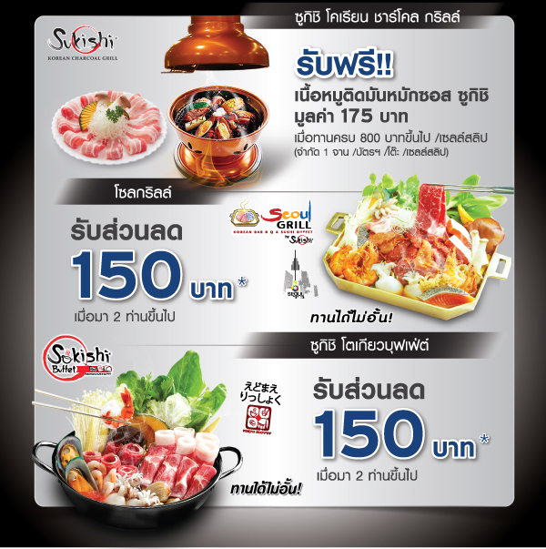 • รับส่วนลด 150 บาท เมื่อมา 2 ท่านขึ้นไป ทานได้ไม่อั้น ที่ร้านโซลกริลล์ และ ซูกิชิ โตเกียวบุฟเฟ่ต์