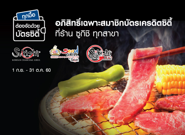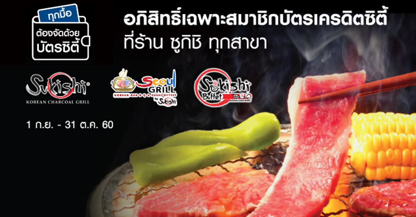 ทุกมื้อต้องจัด ด้วยบัตรเครดิตซิตี้ รับส่วนลดสูงสุด 150 บาท และสิทธิพิเศษเมื่อรับประทานที่ร้านซูกิชิ ทุกสาขา อาทิ ซูกิชิ โคเรียน ชาร์โคล กริลล์, โซลกริลล์ และ ซูกิชิ โตเกียวบุฟเฟ่ต์