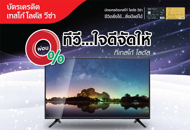 บัตรเครดิตเทสโก้ โลตัส วีซ่า ผ่อนทีวี..ใจดีจัดให้ ผ่อน 0% นาน 10 เดือน พร้อมรับเครดิตเงินคืน 5% ที่เทสโก้ โลตัส ทุกสาขาที่ร่วมรายการ (เมื่อผ่อนชำระสินค้าที่ร่วมรายการนาน 10 เดือน/ เครื่อง/ เซลล์สลิป)