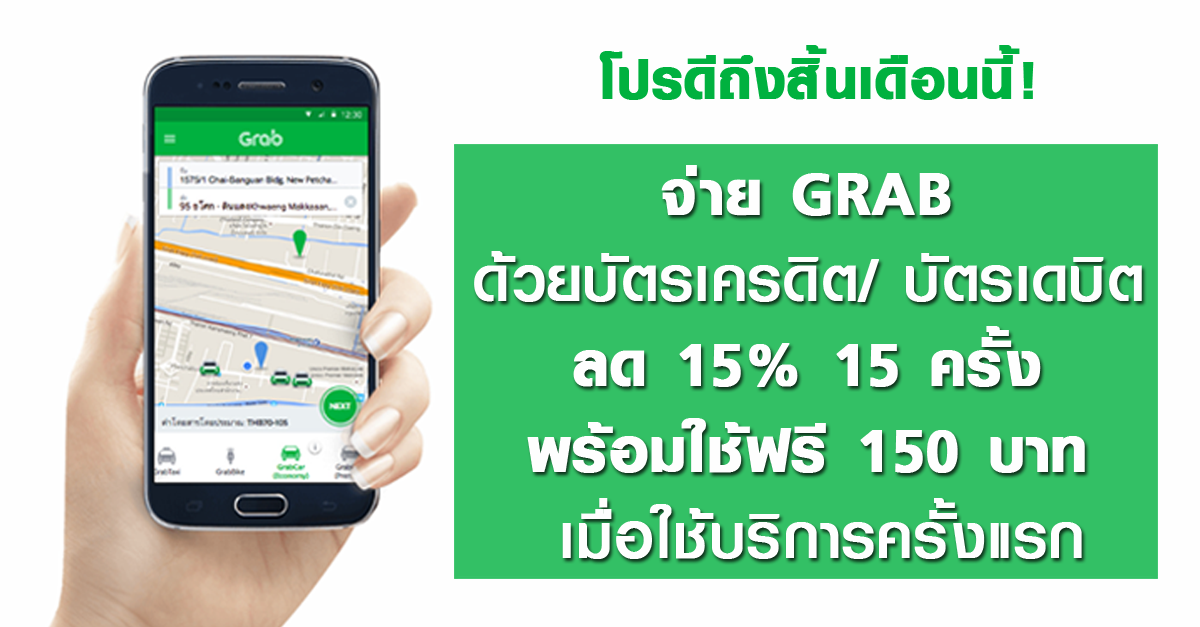 จ่าย Grab ด้วยบัตรเครดิต/ บัตรเดบิต ลด 15% 15 ครั้ง พร้อมใช้ฟรี 150 บาท เมื่อใช้บริการครั้งแรก