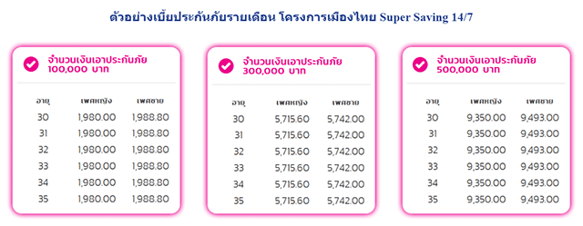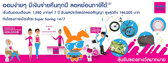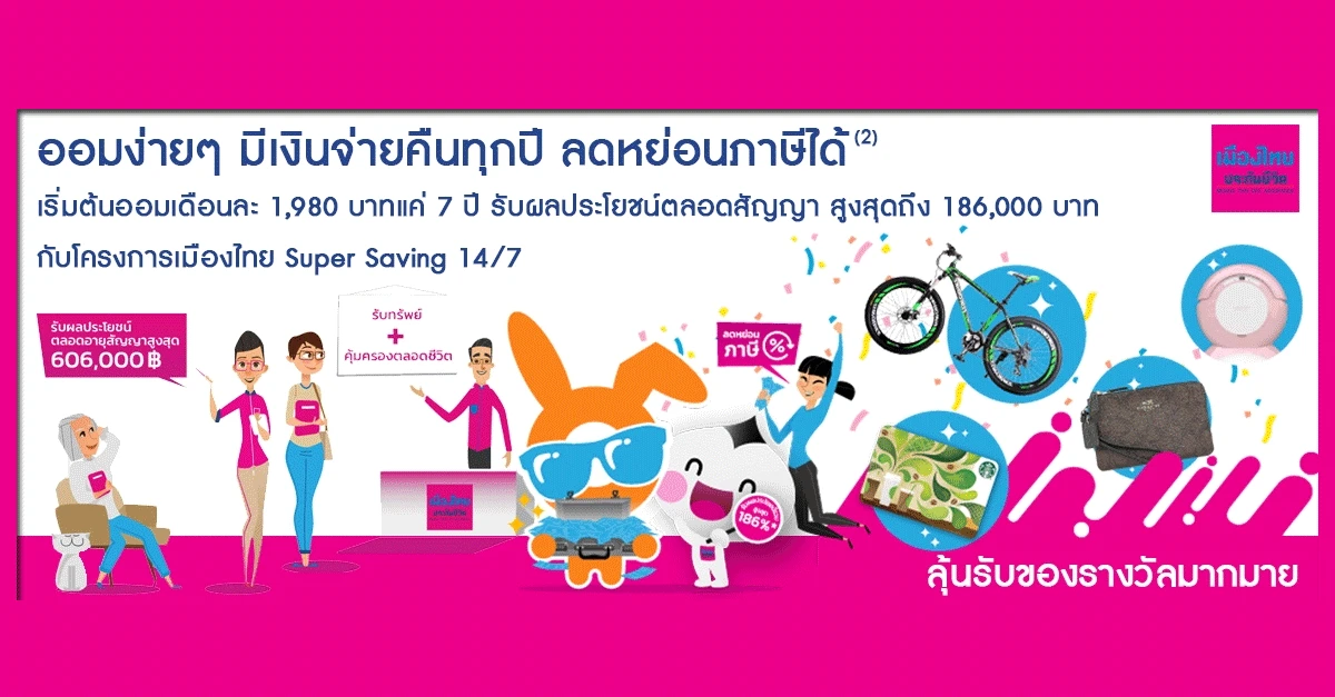 ออมง่ายๆ มีเงินจ่ายคืนทุกปี ลดหย่อนภาษีได้ เริ่มต้นออมเดือนละ 1,980 บาทแค่ 7 ปี รับผลประโยชน์ตลอดสัญญา สูงสุด 186,000 บาทกับโครงการเมืองไทย Super Saving 14/7