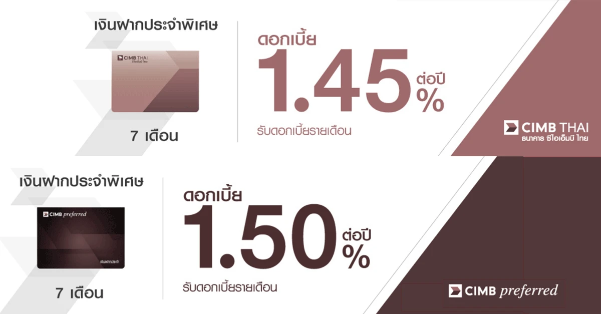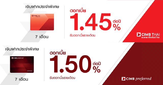 บัญชีเงินฝากประจำพิเศษ 7 เดือน อัตราดอกเบี้ย 1.50% ต่อปี สำหรับลูกค้า CIMB Preferred
