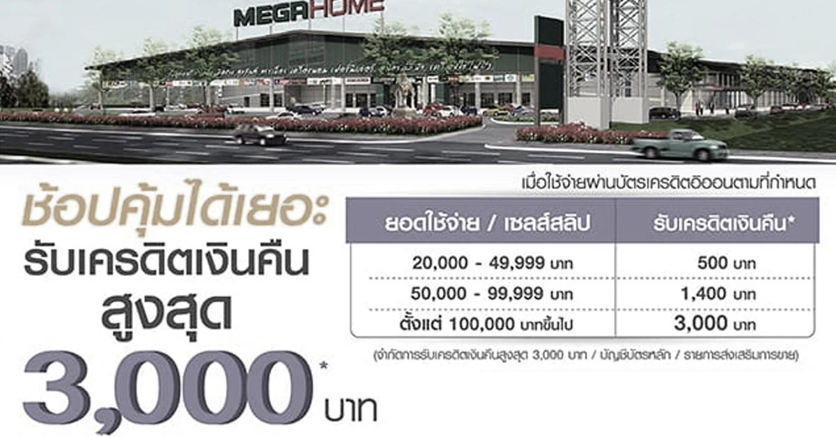 ช้อปคุ้มได้เยอะ รับเครดิตเงินคืนสูงสุด 3,000 บาท เมื่อช้อปที่เมกา โฮม ทุกสาขา ผ่านบัตรเครดิตอิออน