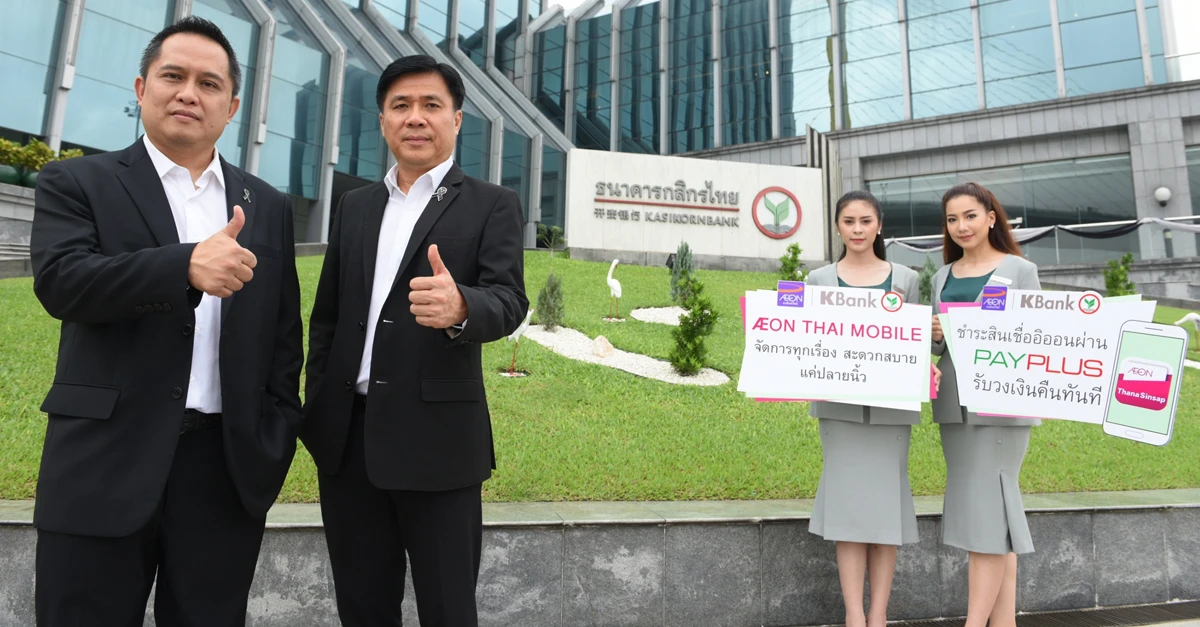 นายอมร สุวจิตตานนท์ (ขวา) ผู้อำนวยการฝ่ายอาวุโส ฝ่ายบริหารผลิตภัณฑ์ชำระเงินลูกค้าบุคคลและปริวรรตเงินตรา ธนาคารกสิกรไทย ร่วมกับ นายนันทวัฒน์ โชติวิจิตร กรรมการบริหาร ฝ่ายการตลาด บริษัท อิออน ธนสินทรัพย์ (ไทยแลนด์) จำกัด (มหาชน) เปิดให้บริการชำระสินเชื่ออิออนผ่านบริการ Pay PLUS ของธนาคารกสิกรไทย บนแอปพลิเคชั่น "ON THAI MOBILE" ได้เป็นธนาคารแรก ซึ่งจะช่วยอำนวยความสะดวกให้ลูกค้าผู้ถือบัตรอิออนกว่า 7 ล้านบัตร ในการชำระสินเชื่ออิออน และลูกค้าจะได้รับวงเงินคืนทันที ณ ธนาคารกสิกรไทย สำนักงานใหญ่ เมื่อเร็ว ๆ นี้