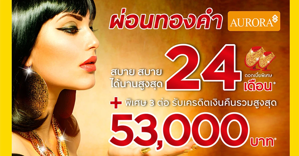 ผ่อนทองคำ Aurora สบาย สบาย ได้นานสูงสุด 24 เดือน พร้อมพิเศษ 3 ต่อ รับเครดิตเงินคืนรวมสูงสุด 53,000 - พิเศษ 1 รับเครดิตเงินคืนสูงสุด 10,000 บาท