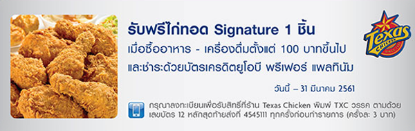 รับฟรีไก่ทอด Signature 1 ชิ้น เมื่อซื้ออาหาร - เครื่องดื่ม ตั้งแต่ 100 บาทขึ้นไป และชำระด้วยผ่านบัตรฯ ที่ร้าน Texas Chicken