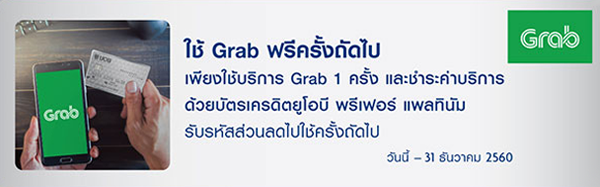 ใช้ Grab ฟรีครั้งถัดไป เพียงใช้บริการ Grab 1 ครั้ง และชำระค่าบริการผ่านบัตรฯ รับรหัสส่วนลดไปใช้ครั้งถัดไป