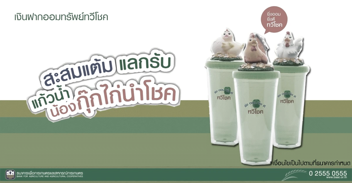 โปรโมชั่นบัญชีเงินฝากออมทรัพย์ทวีโชค "ยิ่งออม ยิ่งดี ทวีโชค" จาก ธ.ก.ส. วันนี้ เพียงสะสมแต้ม แลกรับ แก้วน้ำน้องกุ๊กไก่นำโชค