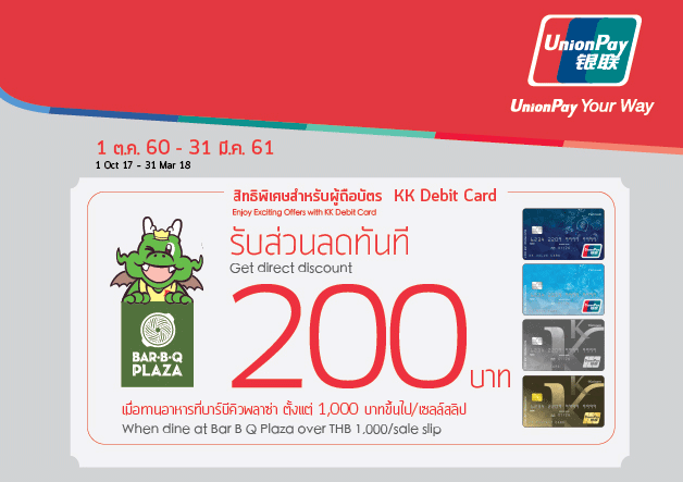 สิทธิพิเศษสำหรับผู้ถือบัตร KK Debit Card UnionPay รับส่วนลดทันที 200 บาท เมื่อทานอาหารที่บาร์บีคิว พลาซ่า ตั้งแต่ 1,000 บาทขึ้นไป/เซลล์สลิป