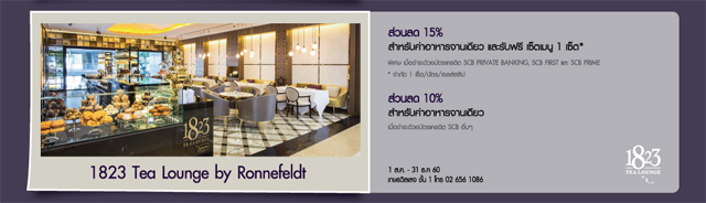 รับส่วนลดสูงสุด 15% สำหรับค่าอาหาร และรับฟรี เซ็ตเมนู 1 เซ็ต ที่ร้าน 1823 Tea Lounge by Ronnefeldt