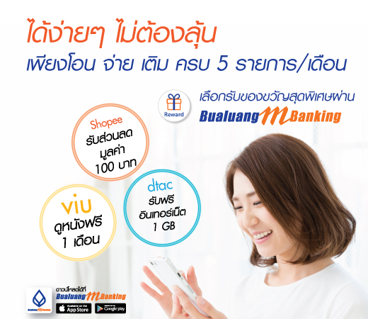 ได้ง่ายๆ ไม่ต้องลุ้น เพียงโอน จ่าย เติม ครบ 5 รายการ/เดือน เลือกรับของขวัญสุดพิเศษผ่านบัวหลวง เอ็มแบงก์กิ้ง