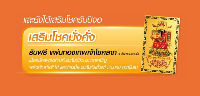 เงื่อนไขเฉพาะ - การเข้าร่วมแคมเปญและการรับของสมนาคุณแผ่นทองเทพเจ้าโชคลาภ - รายการส่งเสริมการขายนี้เฉพาะเบี้ยประกันชีวิตปีแรก เมื่อสมัครผลิตภัณฑ์ประกันชีวิตประเภทสามัญผลิตภัณฑ์ใดก็ได้ โดยต้องมีเงื่อนไขดังนี้ครบทุกข้อ 1. ชำระเบี้ยประกันภัยตั้งแต่ 50,000 บาทขึ้นไป ในช่วงระยะเวลา 1 พ.ย. - 31 ธ.ค. 60 2. ได้รับการอนุมัติกรมธรรม์จากบริษัทฯ ภายในวันที่ 15 ม.ค. 61 3. บริษัทฯ ได้รับแบบฟอร์มหลักฐานการส่งมอบกรมธรรม์จากลูกค้า ภายในวันที่ 5 ก.พ. 61