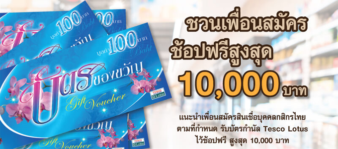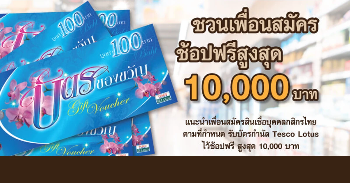 | จำนวนเพื่อนผู้ถูกแนะนำที่ได้รับอนุมัติสินเชื่อ ต่อผู้แนะนำ 1 ท่าน | รับบัตรกำนัล Tesco Lotus (ตั้งแต่รายแรก) |