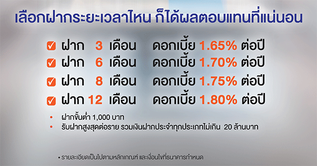 - ฝากประจำ 3, 6, 8 เดือน ได้รับดอกเบี้ยเมื่อครบกำหนด