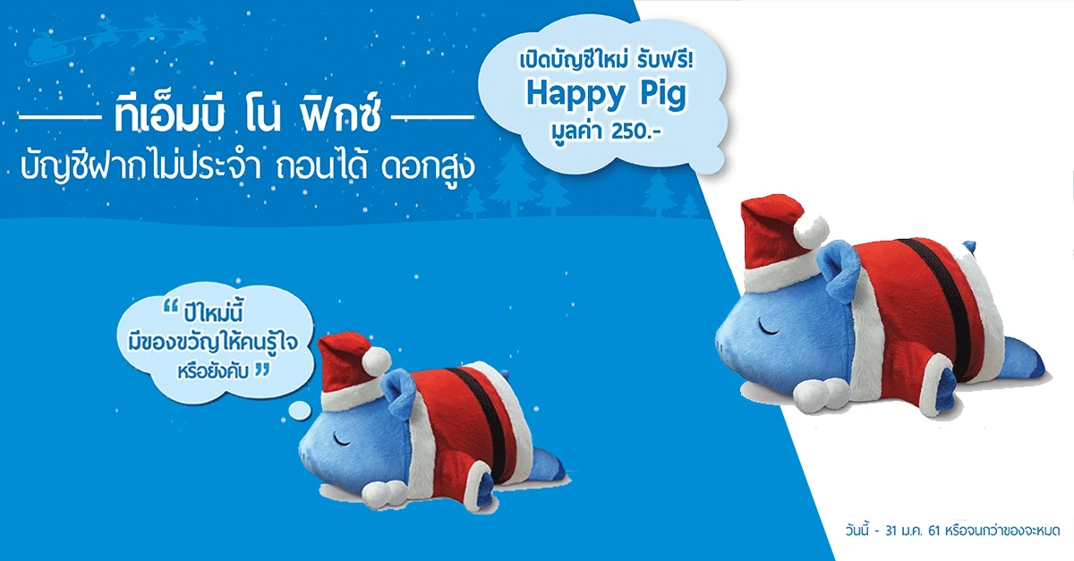 ปีใหม่นี้.. เปิดบัญชี ทีเอ็มบี โน ฟิกซ์ ตั้งแต่ 10,000 บาทขึ้นไป รับฟรี! Happy Pig มูลค่า 250 บาท ไปเป็นของขวัญให้คนที่รู้ใจได้เลย