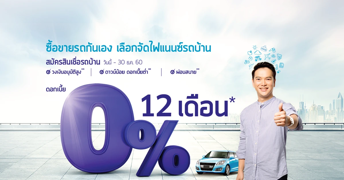 เงื่อนไขแคมเปญ - เฉพาะลูกค้าที่สมัครใช้บริการสินเชื่อรถยนต์มือสอง (รถบ้าน) ตั้งแต่วันนี้ - 30 ธ.ค. 60 เท่านั้น