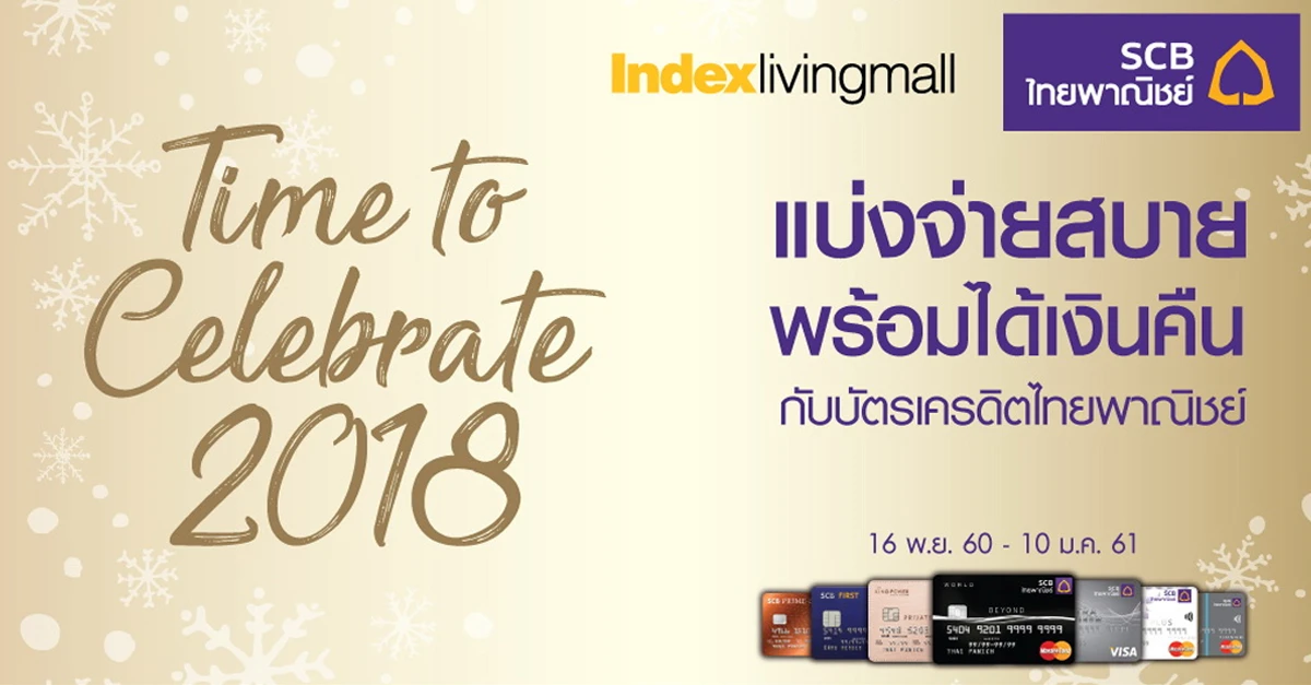 Time to Celebrate 2018 แบ่งจ่าย 0% พร้อมรับเงินคืน 36,000 บาท ที่ Index Living Mall จากบัตรฯ SCB