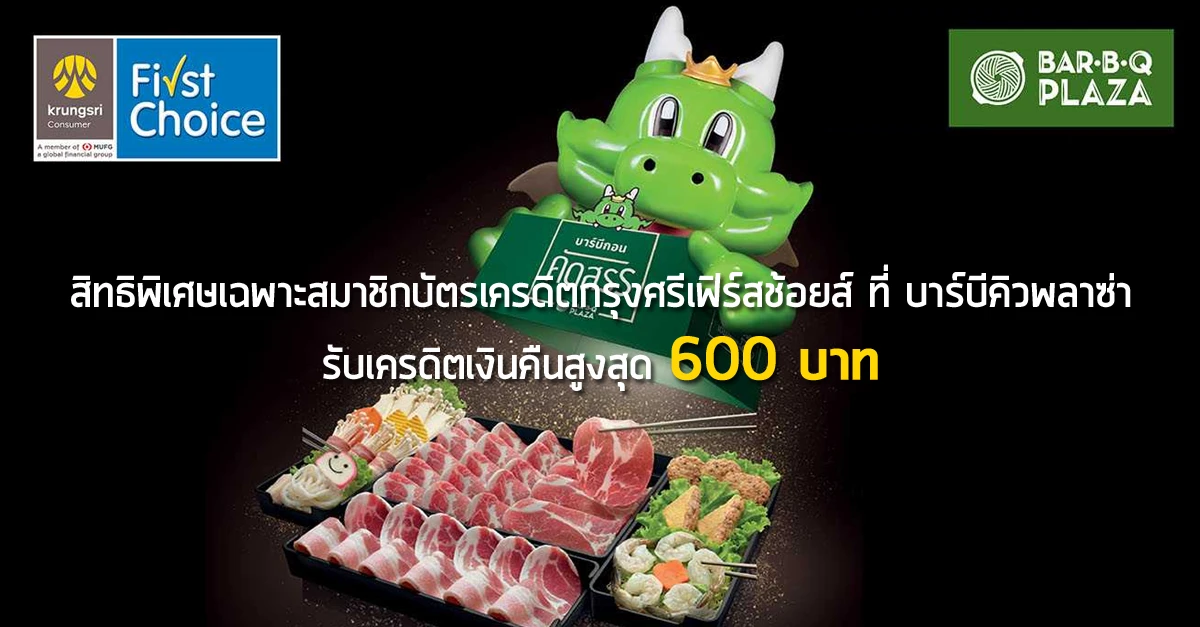 รับเครดิตเงินคืนสูงสุด 600 บาท เมื่อทานอาหารที่ร้าน BAR-B-Q PLAZA ครบทุกๆ 1,000 บาทขึ้นไป/ เซลล์สลิป และชำระผ่านบัตรเครดิตกรุงศรีเฟิร์สช้อยส์ (จำกัด 300 บาท/ เดือน/ หมายเลขบัญชีบัตรหลัก ตลอดรายการไม่เกิน 600 บาท)