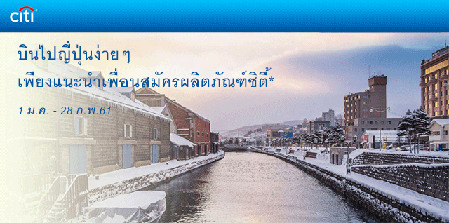 บินไปญี่ปุ่นง่ายๆ เพียงแนะนำเพื่อนสมัครผลิตภัณฑ์ ซิตี้ สำเร็จครบ 5 ท่าน รับ 60,000 คะแนนสะสมแอร์เอเชียบิ๊ก (เทียบเท่ากับการแลกตั๋วเครื่องบินไปกลับ กรุงเทพ - โตเกียว 1 ที่นั่ง) จากการแนะนำเพื่อนสมัครบัตรฯ ซิตี้ และ/หรือ บัญชีซิตี้โกลด์ ระหว่างวันที่ 1 ม.ค. - 28 ก.พ.61