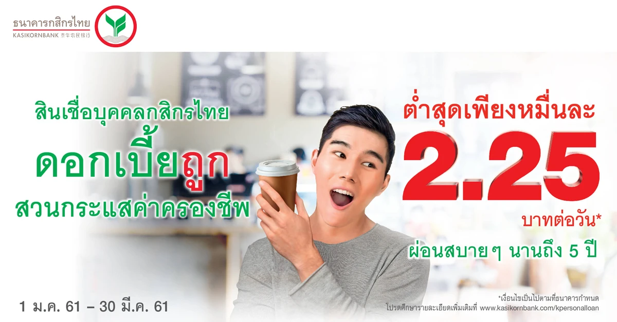 สินเชื่อบุคคลกสิกรไทย ดอกเบี้ยต่ำสุดหมื่นละ 2.25 บาทต่อวัน