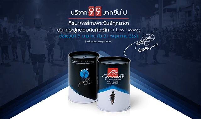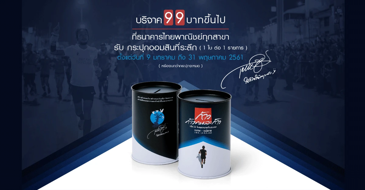 โครงการก้าวคนละก้าว : บริจาค 99 บาทขึ้นไปที่ธนาคารไทยพาณิชย์ทุกสาขา รับฟรี!กระปุกออมสินที่ระลึก 1 ใบต่อ 1 รายการ ตั้งแต่วันที่ 9 มกราคม ถึง 31 พฤษภาคม 2561 (หรือจนกว่ากระปุกจะหมด)