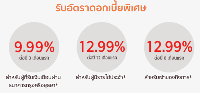 เงื่อนไขการรับอัตราดอกเบี้ยพิเศษ - อัตราดอกเบี้ย 9.99% ต่อปี 3 เดือนแรก สำหรับพนักงานประจำที่รับเงินเดือนผ่านธนาคารกรุงศรีอยุธยา อายุงานตั้งแต่ 1 ปีขึ้นไป รายได้เป็นไปตามหลักเกณฑ์ของธนาคารกรุงศรีอยุธยา และรับเงินกู้โดยวิธีโอนเงินเข้าบัญชีเงินฝากธนาคารเท่านั้น