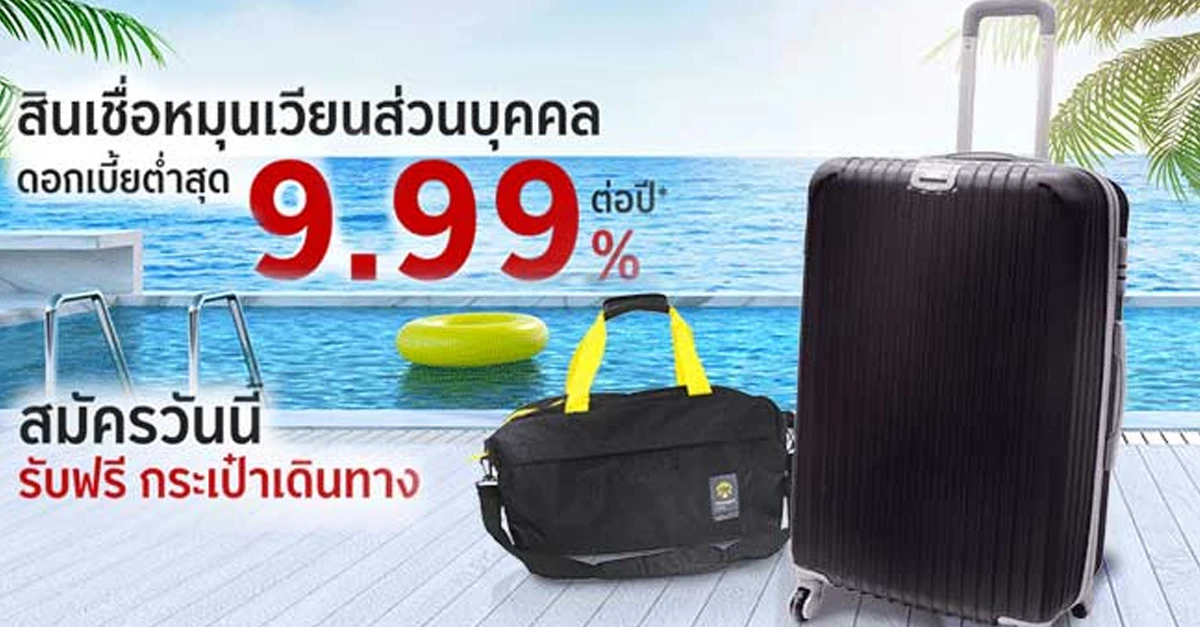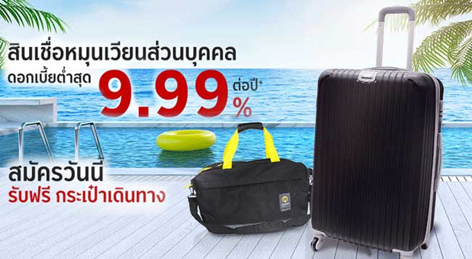 สินเชื่อหมุนเวียนส่วนบุคคล ธ.กรุงศรีฯ ดอกเบี้ยต่ำสุด 9.99% ต่อปี สมัครวันนี้ รับฟรี! กระเป๋าเดินทาง