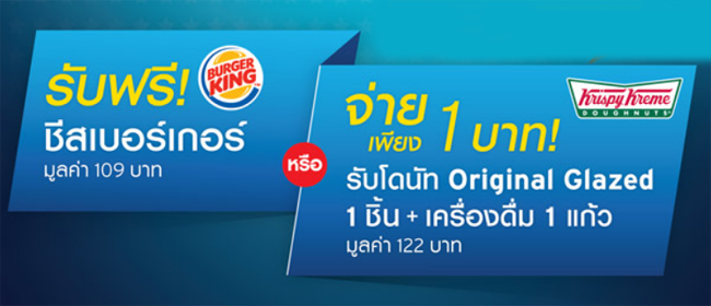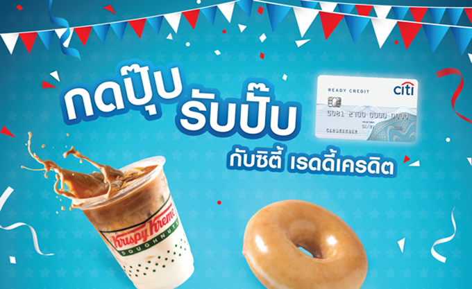 • สมาชิกบัญชีซิตี้ เรดดี้เครดิต รับฟรี ชีสเบอร์เกอร์ 1 ชิ้น มูลค่า 109 บาท จาก Burger King หรือจ่ายเพียง 1 บาท รับโดนัท Original Glazed 1 ชิ้น + เครื่องดื่ม 1 แก้ว (ลาเต้เย็น หรือชาเขียวเย็น) มูลค่า 122 บาท จาก Krispy Kreme
